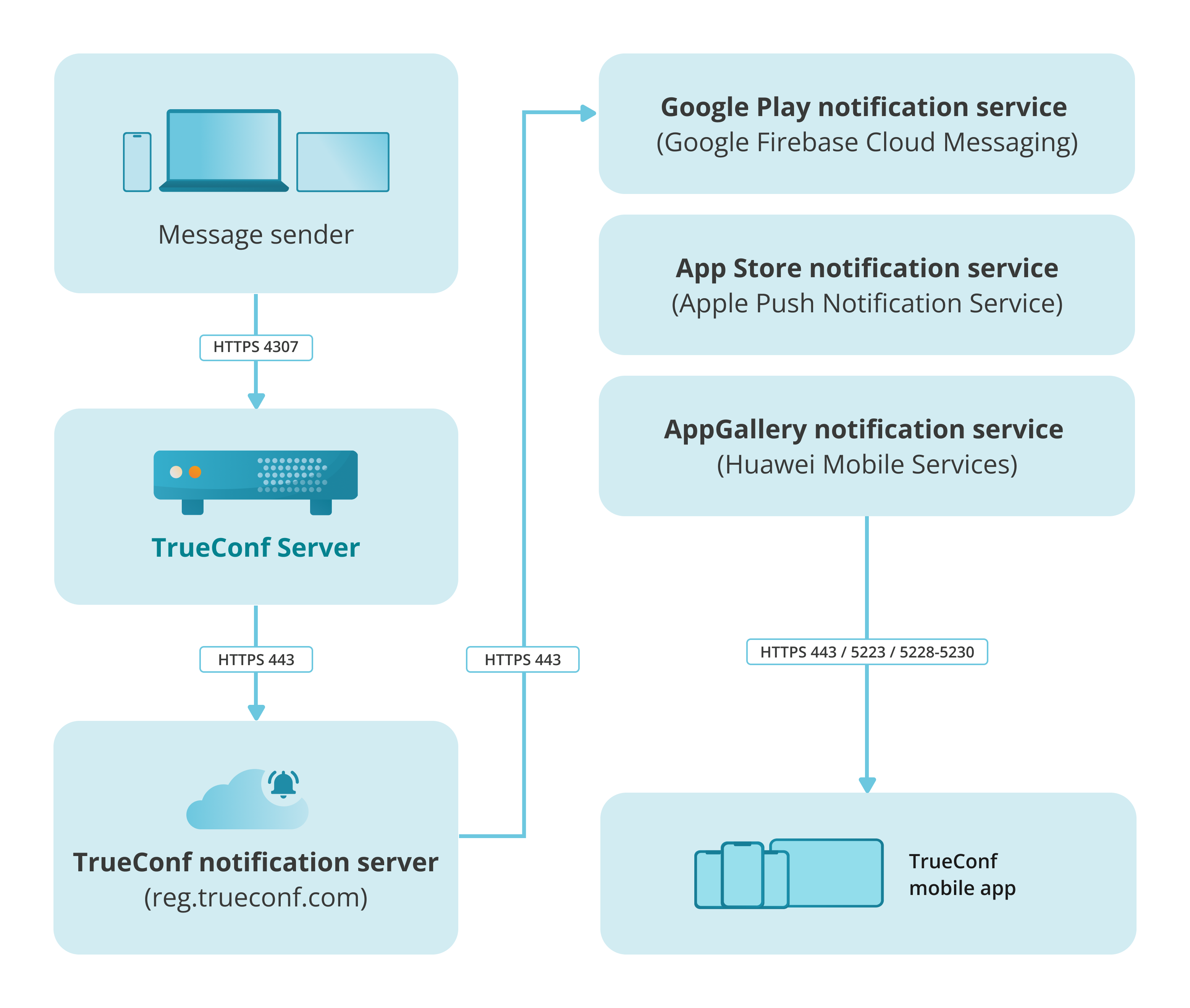 - When a message is sent by the initiating client, TrueConf Server contacts the TrueConf notification server at