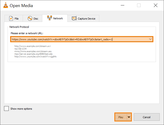- From the dropdown, select Open Network Stream, paste your URL into the field, and click Play6