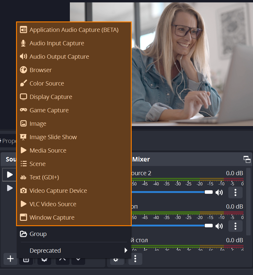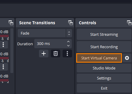 button and choose from the list what you would like to place on your scene: - After adding all the necessary sources, click the Start Virtual Camera button in the Controls menu: