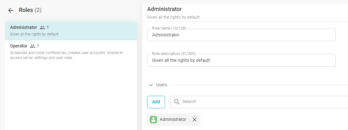 TrueConf MCU has two roles for accessing its management panel: Administrator and Operator. To learn about the permissions associated with these roles, please refer to our documentation.