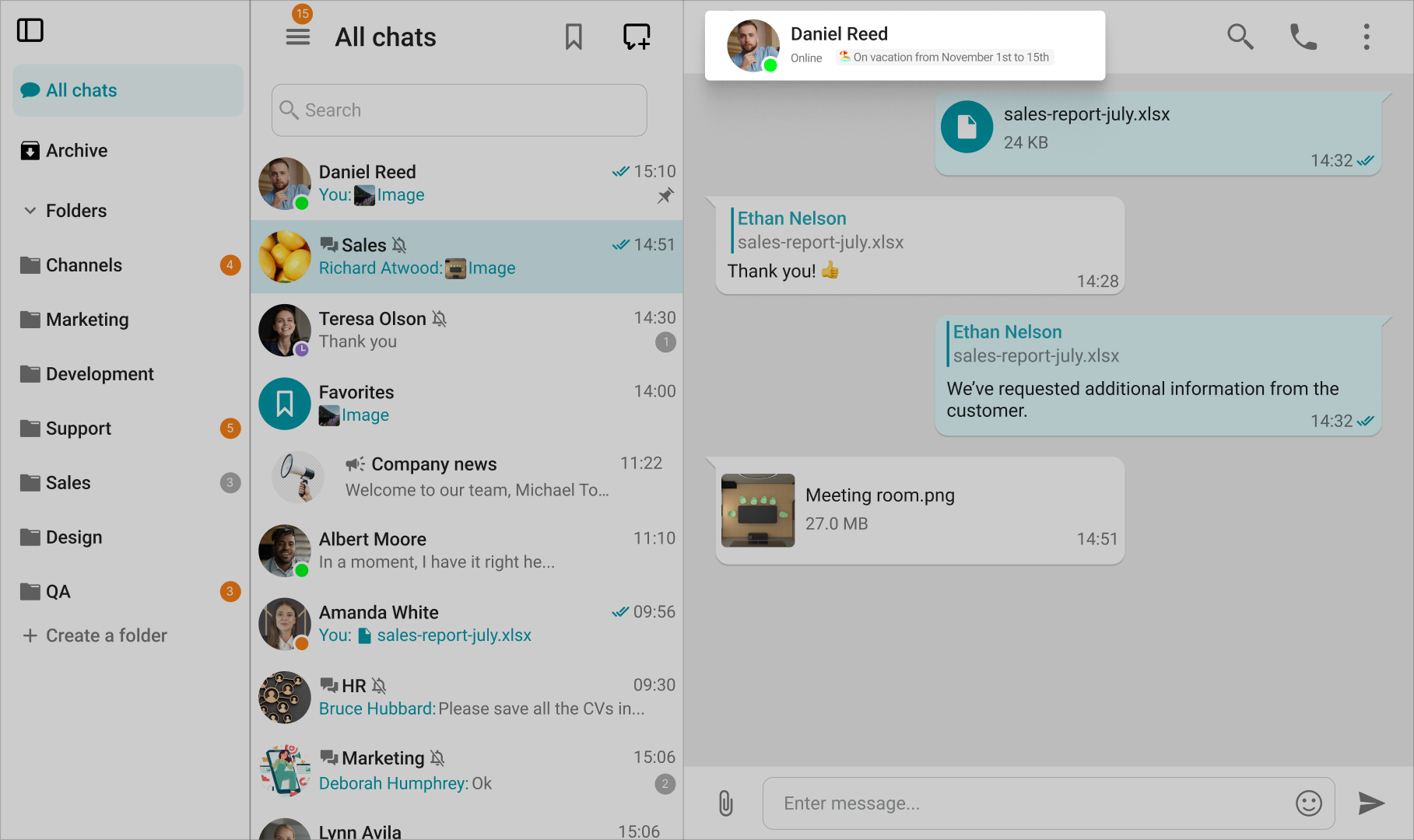 An additional status is now displayed in the chat with the selected user. This will allow you to navigate the work schedule of colleagues and redirect urgent questions to colleagues who are currently available.