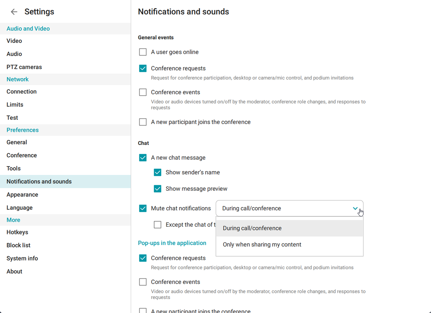 In addition, you can disable notifications from all chats for the duration of the current conference or for a set time, which will help you better focus on work tasks and meetings.
