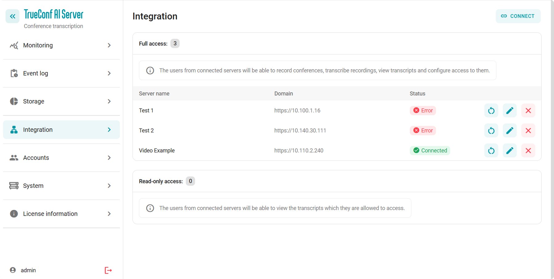 Servers can be connected with either full access level or read-only access level. Full access unlocks all transcription capabilities for the users of the selected video conferencing server. Read-only access allows users of the selected video conferencing server to view conference transcripts shared by users from other servers.