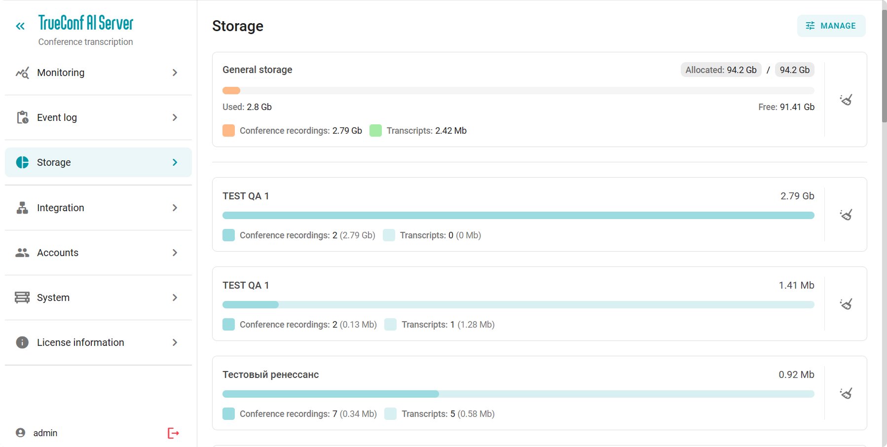 Information about the space occupied by conference recordings and transcripts from all video conferencing servers can be viewed in the Storage section. By clicking the icon, you can clear all materials from a selected video conferencing server or from all servers at once.