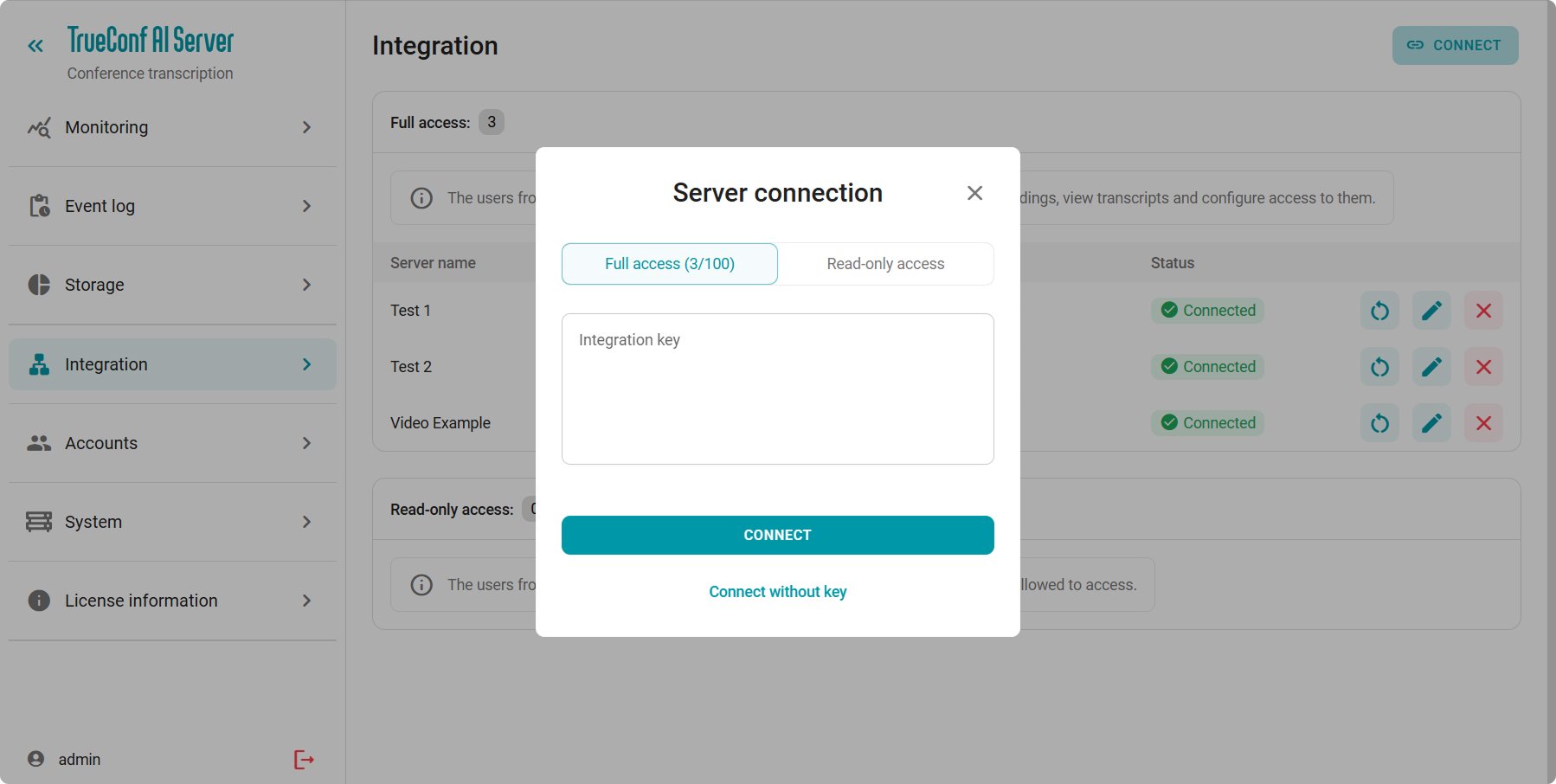 How to set up? Go to the Integration section in the TrueConf AI Server control panel and click the Connect button. Then, paste the server key which was generated on the TrueConf Server side beforehand.
