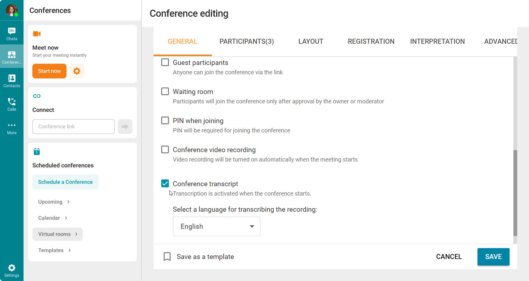 How to enable? When creating a conference, go to the General tab and enable the Conference transcript option.