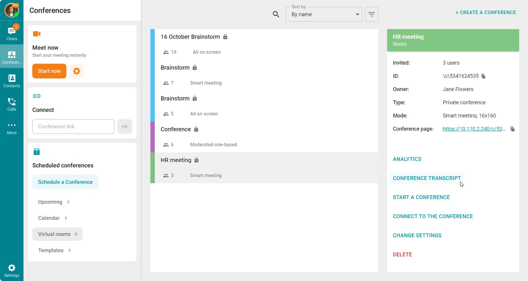 Conference transcription can be enabled when creating a scheduled conference or a virtual room in TrueConf client applications, the user’s personal area, or the TrueConf Server control panel.