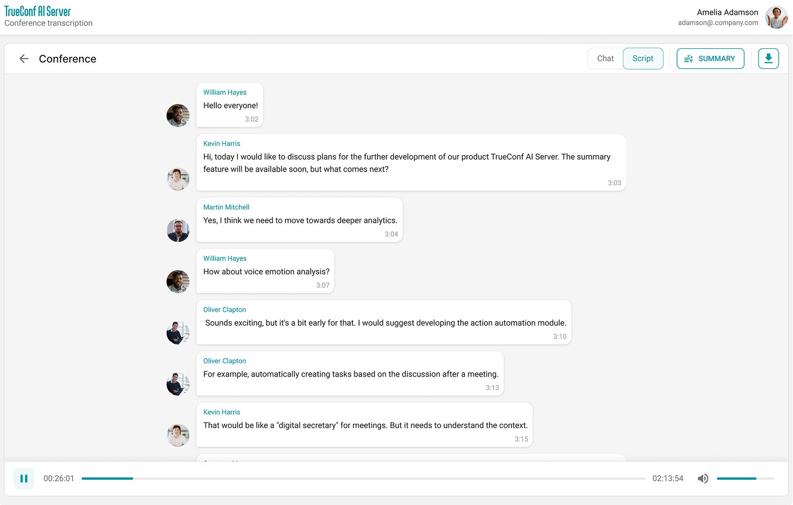 We’re glad to announce the release of TrueConf AI Server 1.0 — our new product for conference transcription! The solution automatically captures all the details of discussions during online meetings and multi-user video conferences, generating detailed transcripts with the ability to export and maintain a text archive.