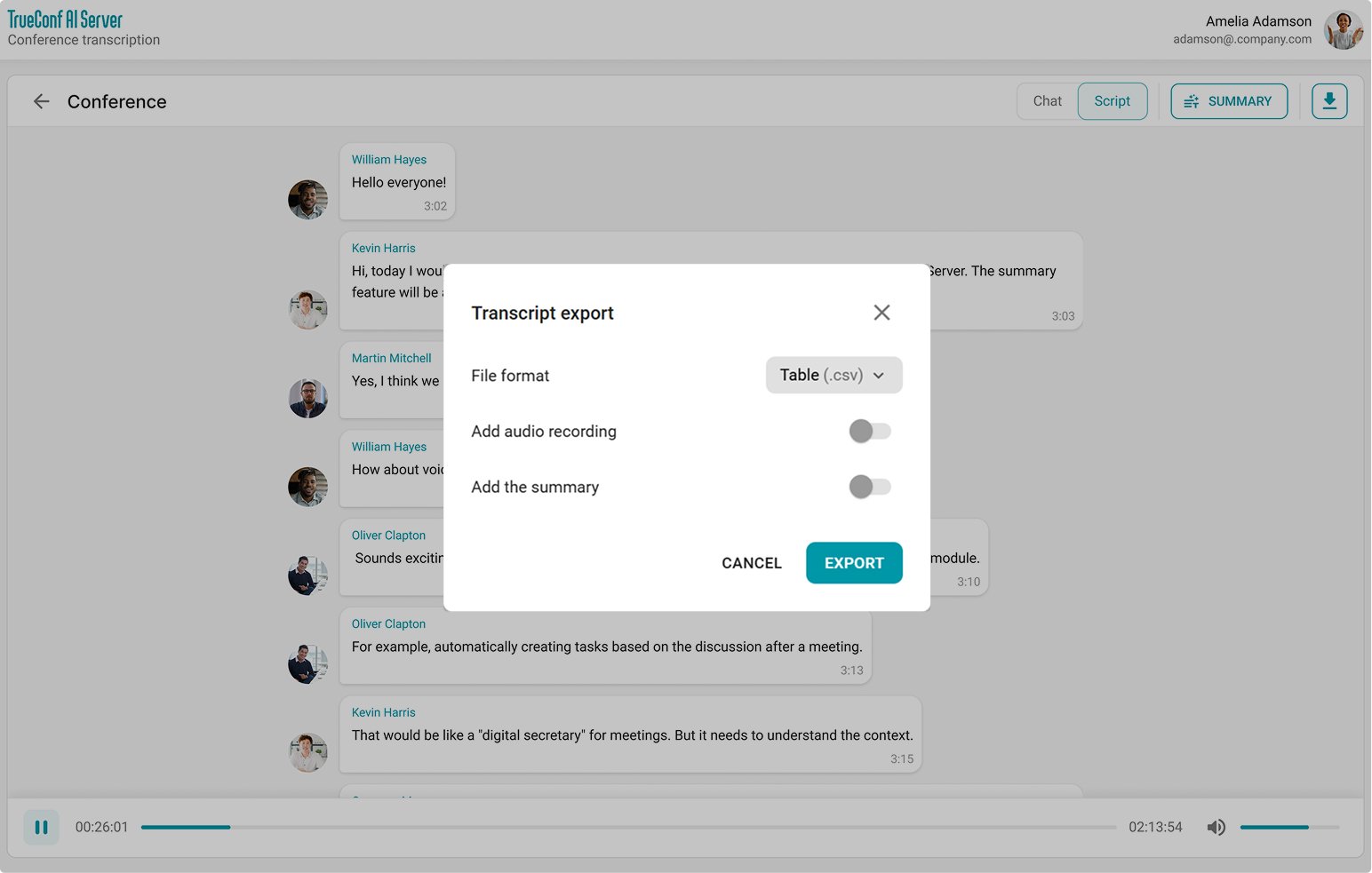 TrueConf AI Server users can also save the transcription results in a text format or as a table. The conference audio recording can also be added to the transcription. Maintaining a meeting archive in this format will significantly save space without the need to sacrifice any information.