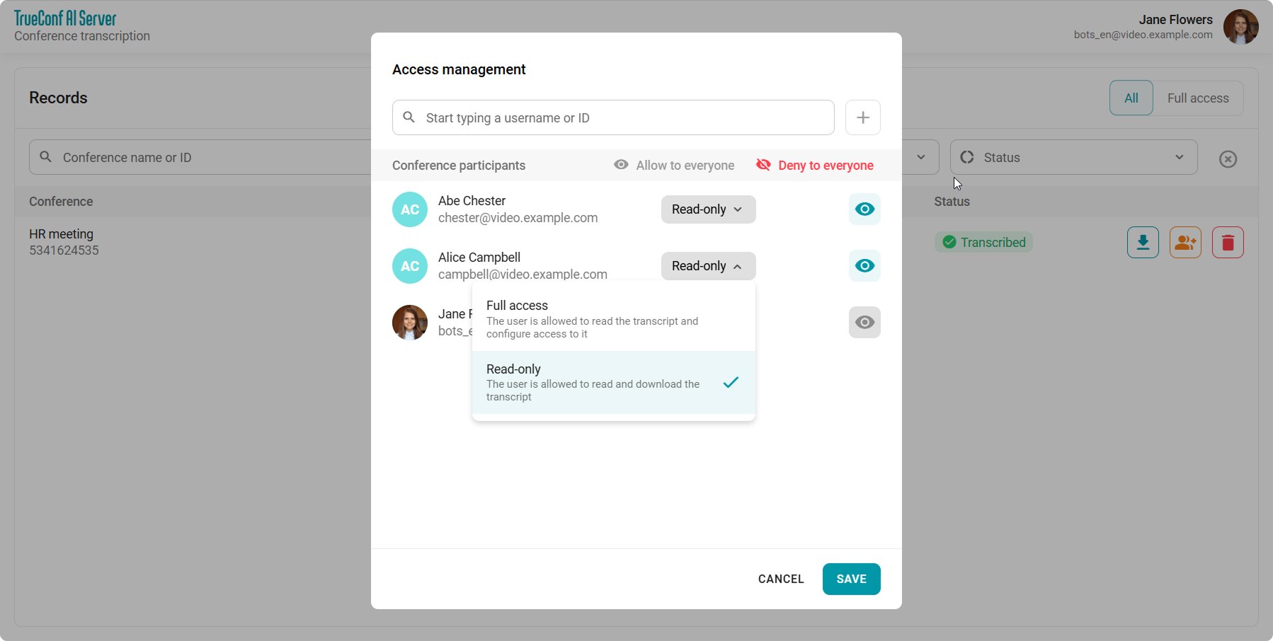 Users with full access to the transcript can share it with other users from any video conferencing server that is integrated with TrueConf AI Server. By clicking the icon in the transcripts list or on the final transcription page, you can configure the access level: