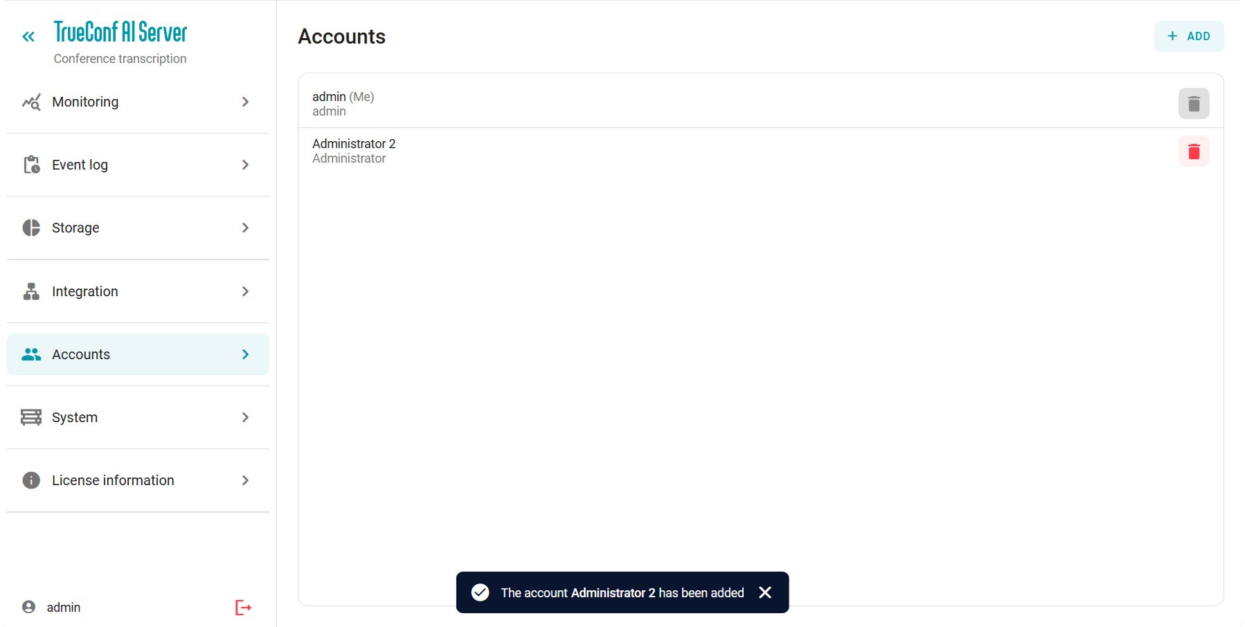The TrueConf AI Server administrator can add other administrators with full access to the transcription server’s control panel in the Accounts section.