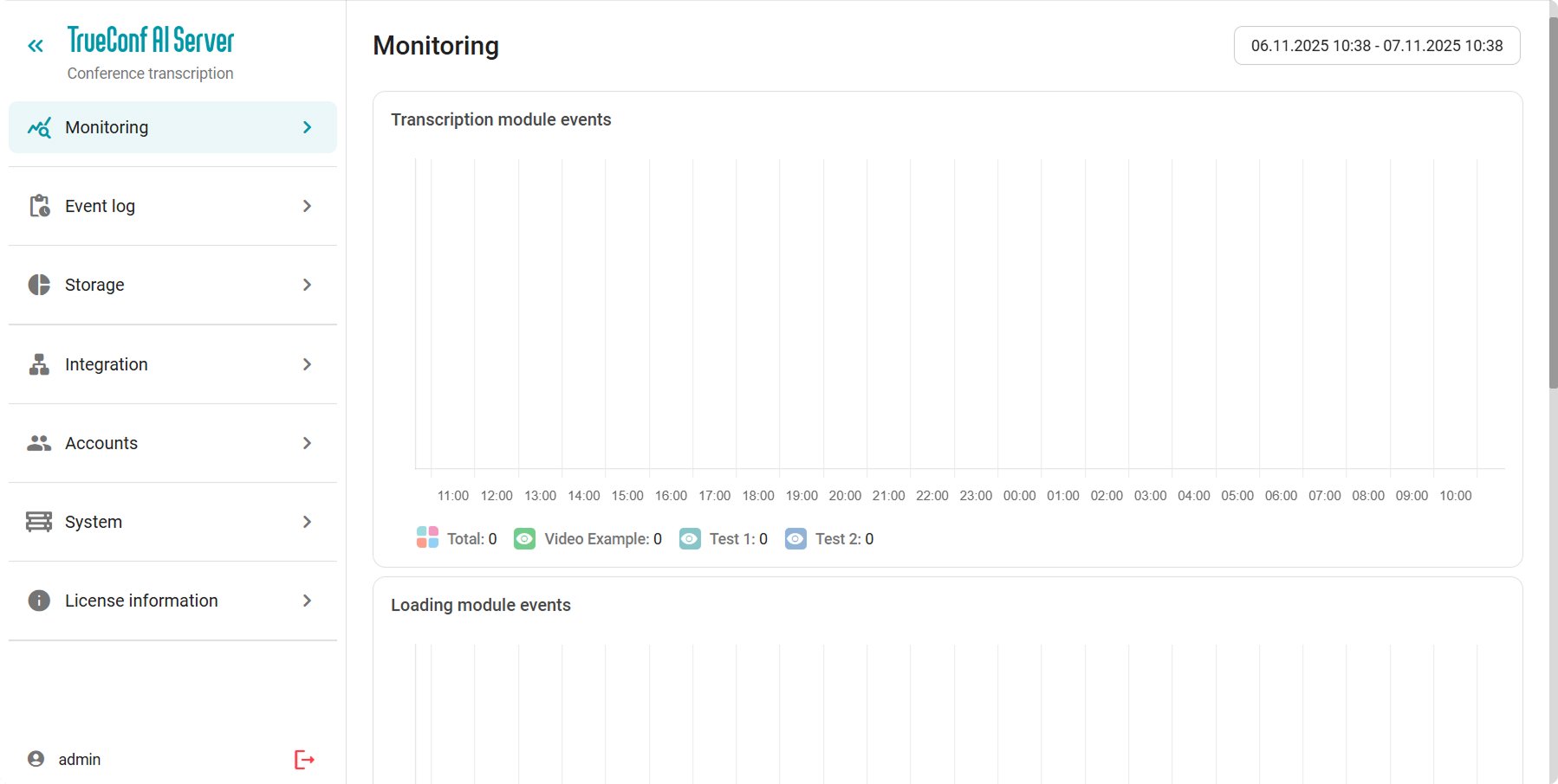 The TrueConf AI Server control panel provides the Monitoring section, which allows tracking the operation of transcription and download modules in real time. This enables quick identification of failures in the transcription server’s operation and monitoring of its availability.