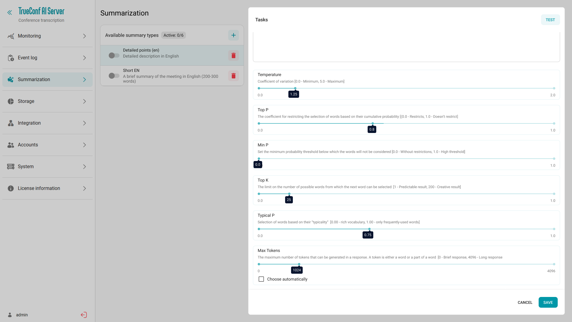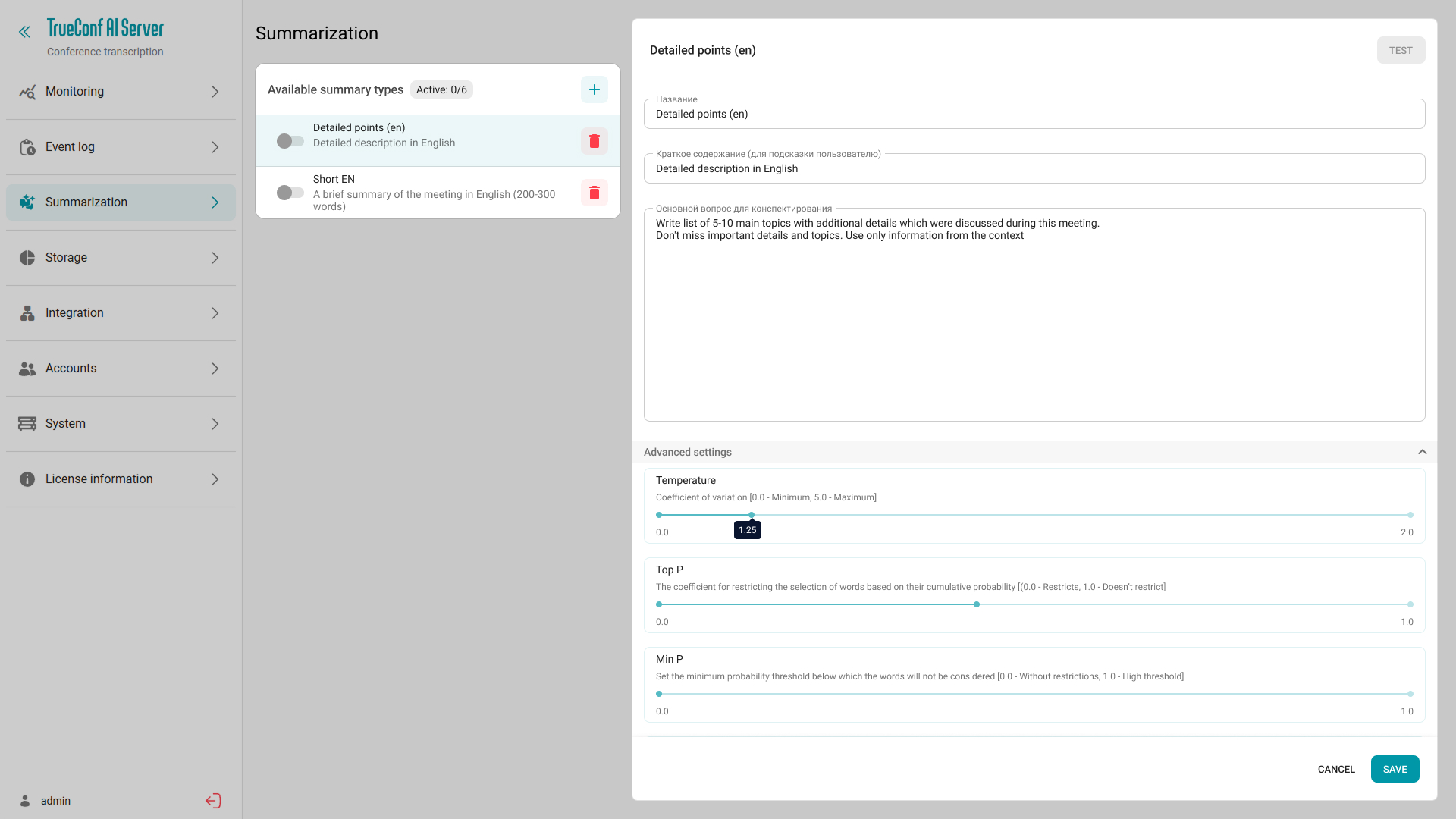 In the TrueConf AI Server control panel, administrators can activate, create, or edit prompts. For each summary type, you can set a name and a brief description which will be displayed to a user when starting meeting summarization, as well as the prompt for the AI, which will be used to generate the meeting summary.