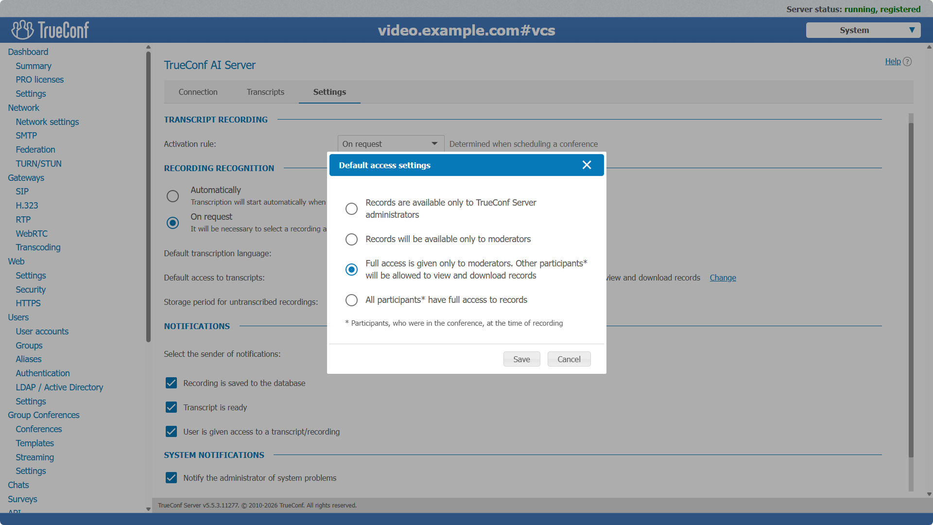 How to do it? In the TrueConf Server control panel, go to the TrueConf AI Server – Settings section and select the desired option.