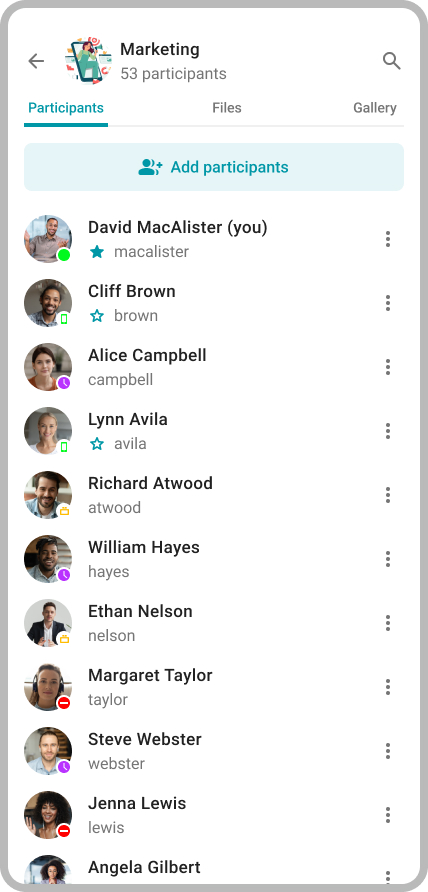 All media files sent in group and private chat are now collected in the Gallery section. In addition, we have added file and group chat participants search.