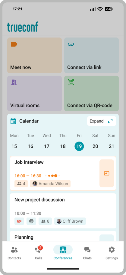 We have added a list of scheduled events to the Conference tab. You can now view upcoming meetings in advance and quickly join them without having to search for a link or conference ID.