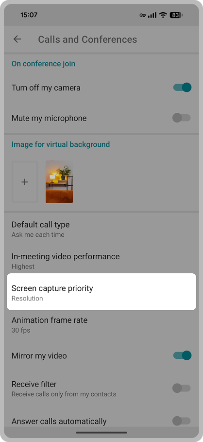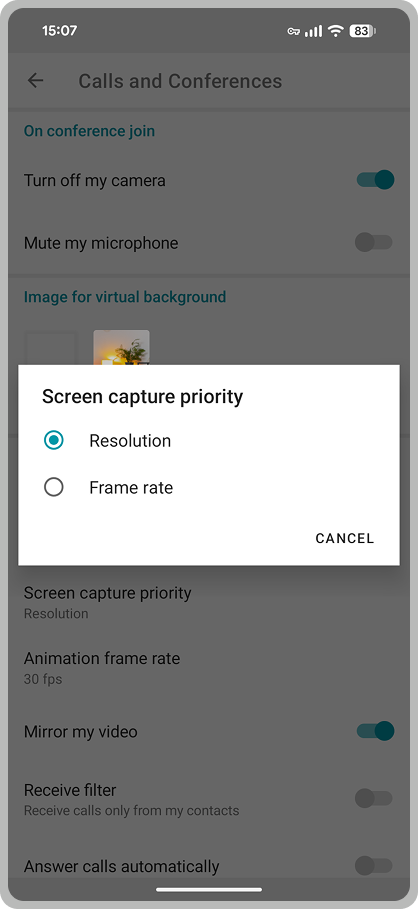Users of TrueConf for Android can now adjust screen sharing quality, prioritizing either High resolution or Higher frame rate. When sharing documents or presentations, we recommend choosing high resolution. For dynamic content (such as videos), prioritize frame rate for a smoother streaming.
