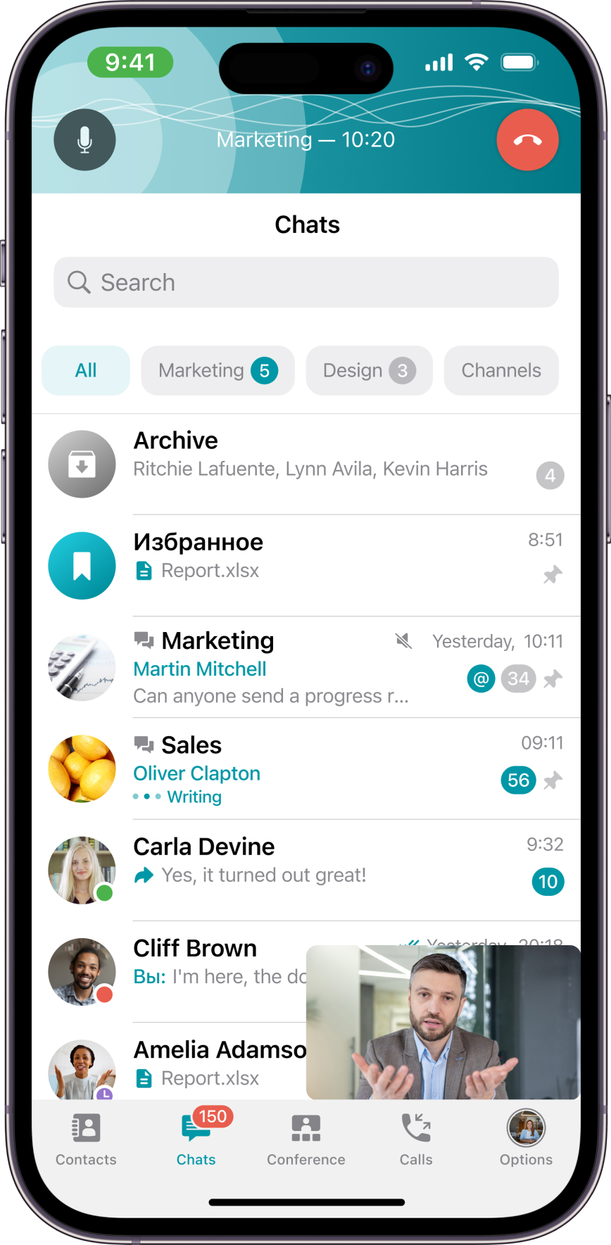 We have added a compact panel for the current call, which appears during correspondence or work in other sections of the application when participating in a call or conference. Now you can instantly return to a running conference at any time, as well as manage the microphone.