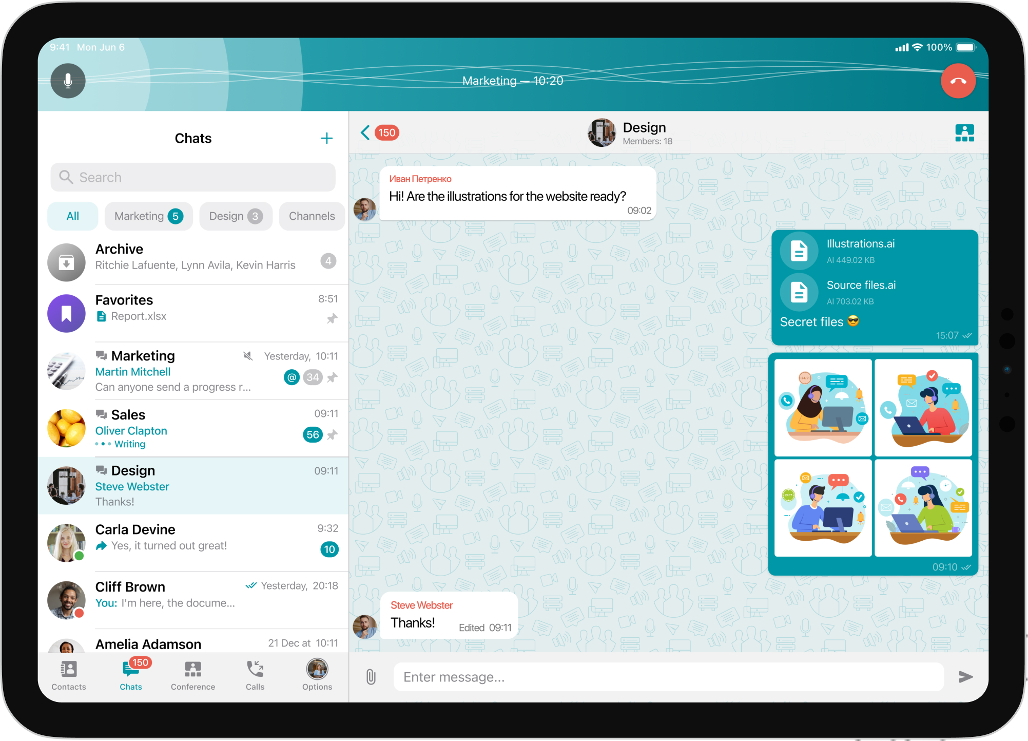 With the new version of TrueConf for iPadOS, your device will become a full-fledged tool for corporate communications, thanks to a tablet mode specially adapted for working on a large screen. Intuitive navigation and quick access to basic features make it easy to work with chats and easily switch between tasks.