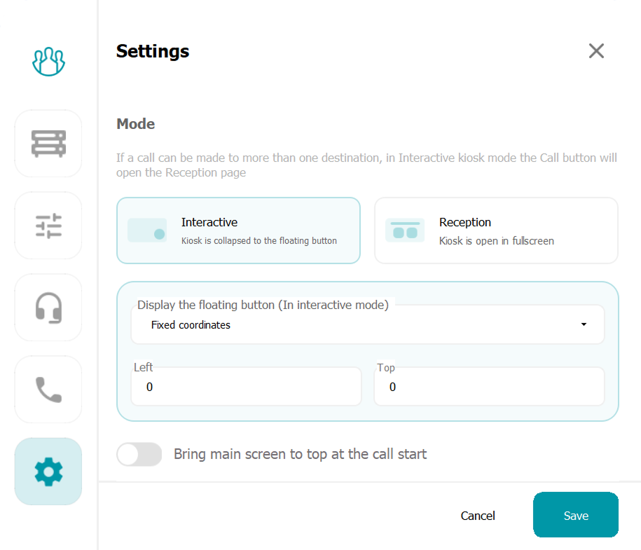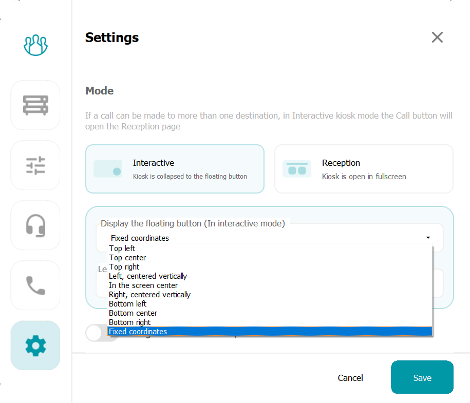 In the 4.0 update, we added a special operation mode where TrueConf Kiosk is hidden under a small button that is displayed over the OS desktop. Now you can customize its location by selecting one of the suggested placement options or setting the exact coordinates on the screen.