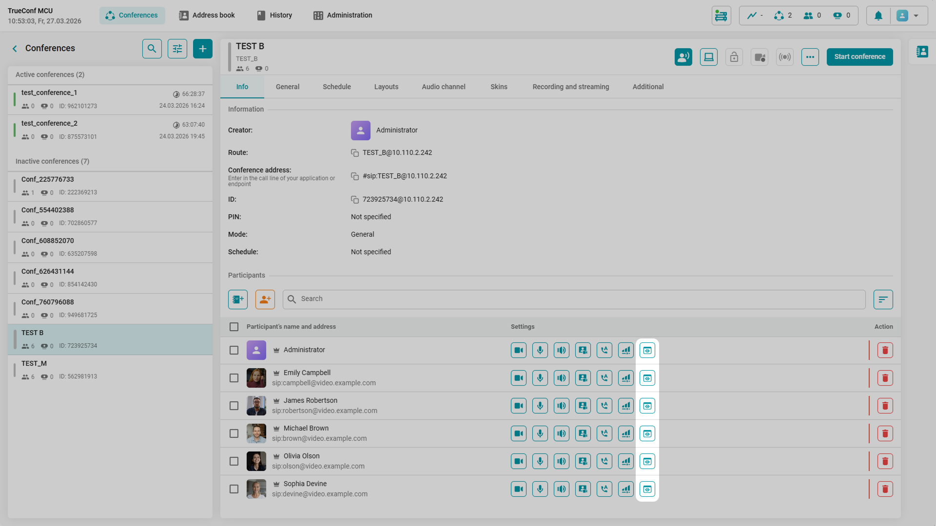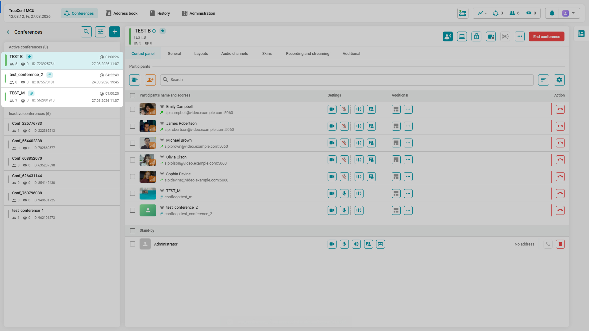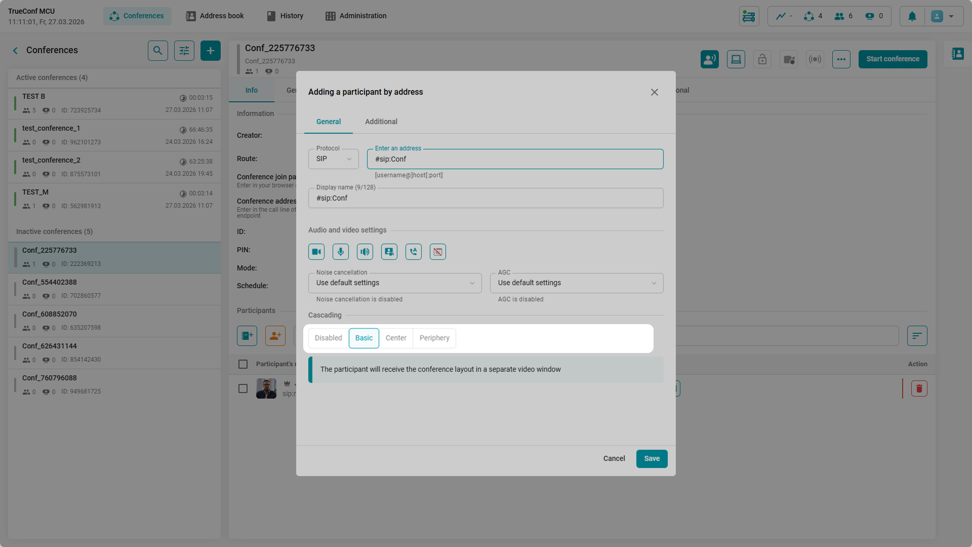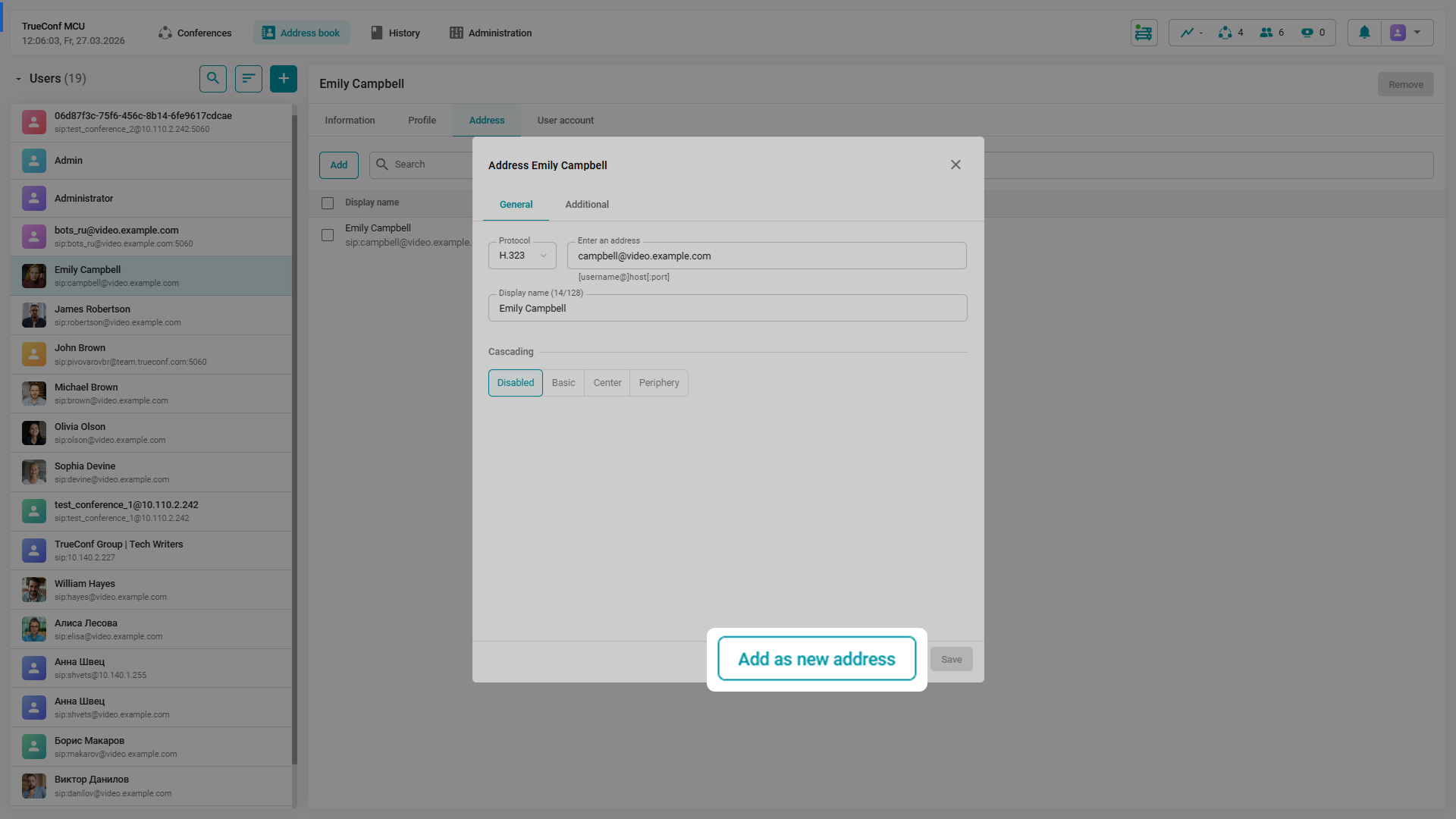 In TrueConf MCU 2.2, you can edit the connection address or the display name of any participant on the fly. All made changes can be saved in the current card and added as a new contact. This enables quick reconnection of the participant who switched the endpoint, or streamlines account creation for users from the same video conferencing server.