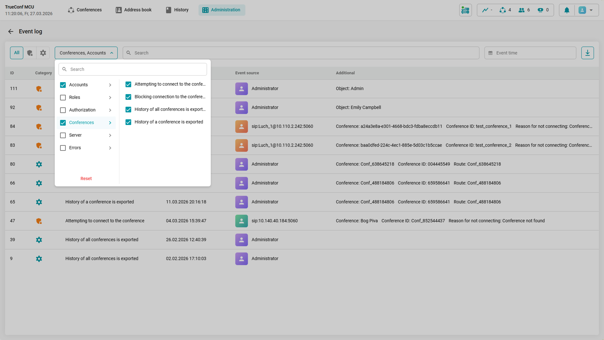 Besides, if necessary, you can export the history of the selected event for further analysis, or the entire conference history at once.