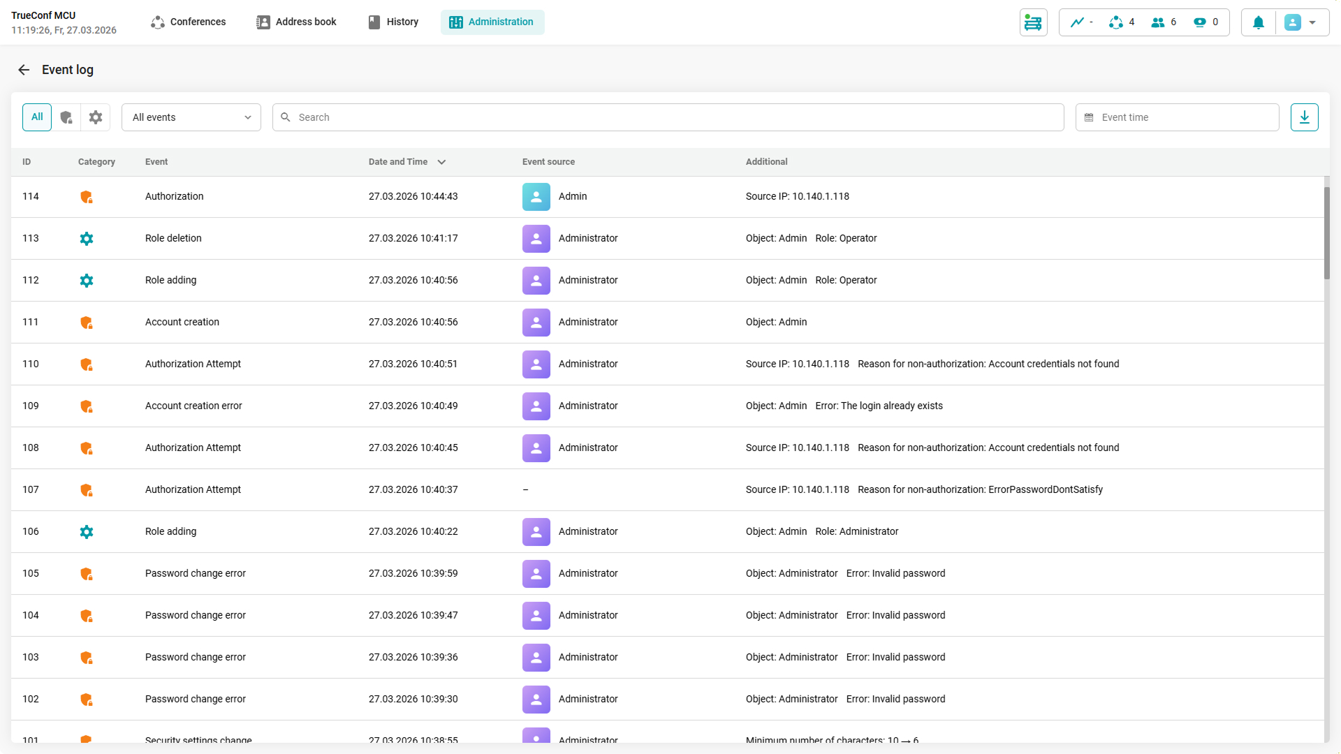 We’ve added the Event log section which contains all changes to the settings of the video conferencing server and its status, as well as attempts to log in or connect to the conference. All events are organized into two categories: Security and System.