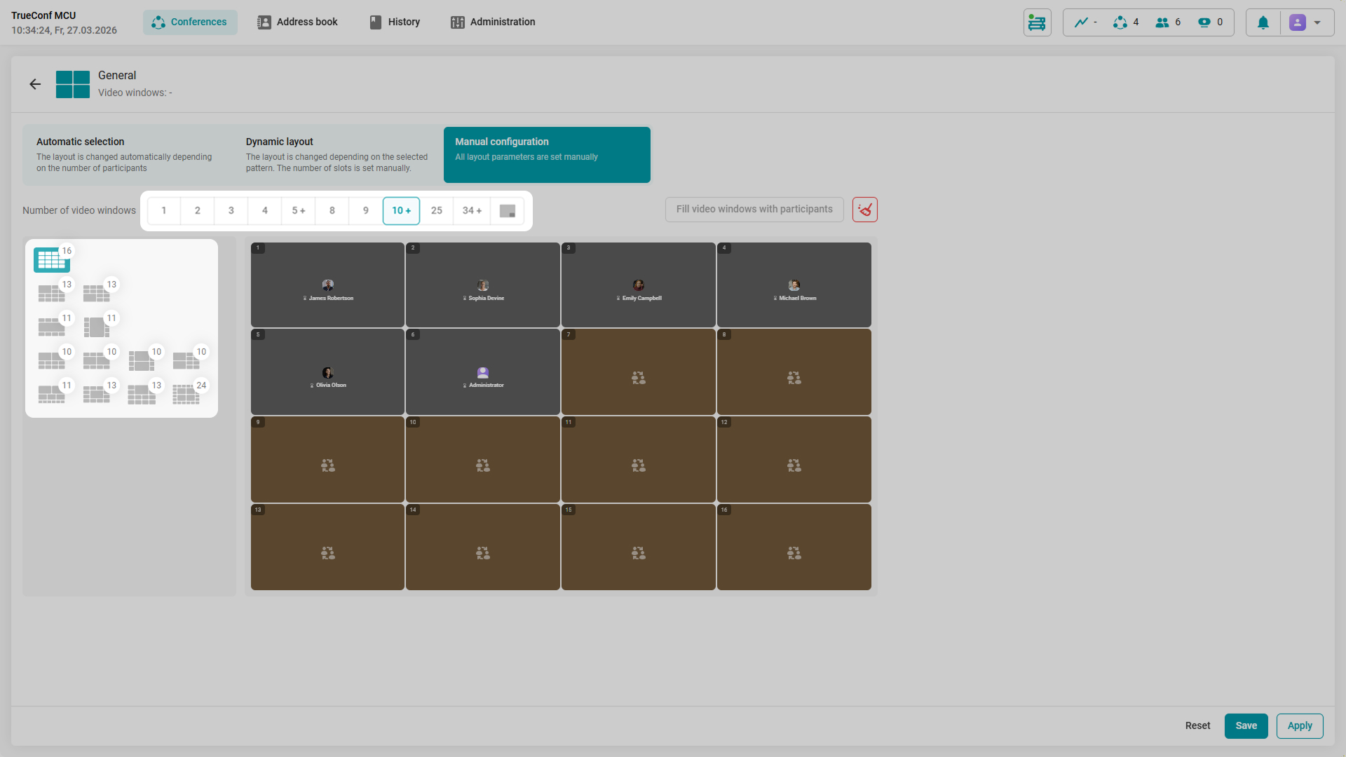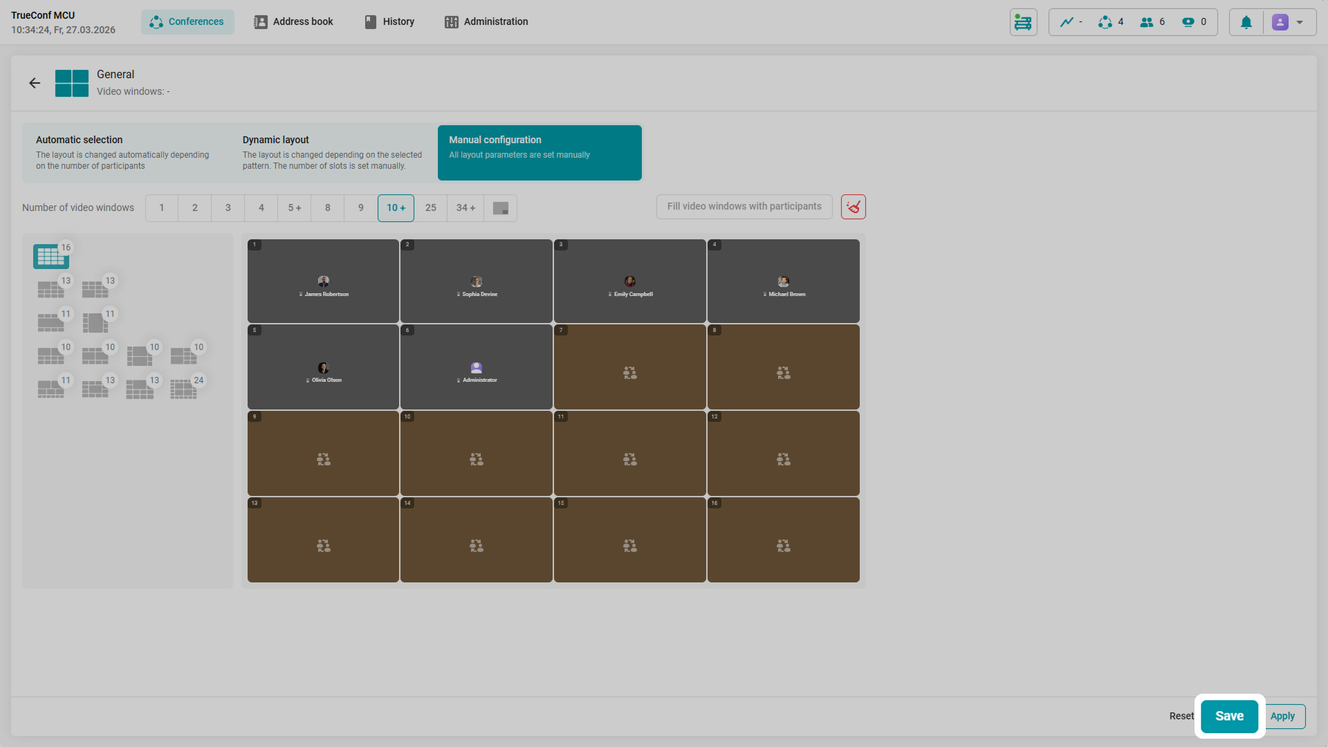 How to create a template? Select the Manual configuration of the layout, choose the appropriate scheme and the number of participants on the screen, and then click Save. To switch templates during a conference, just select the desired template and click Apply.