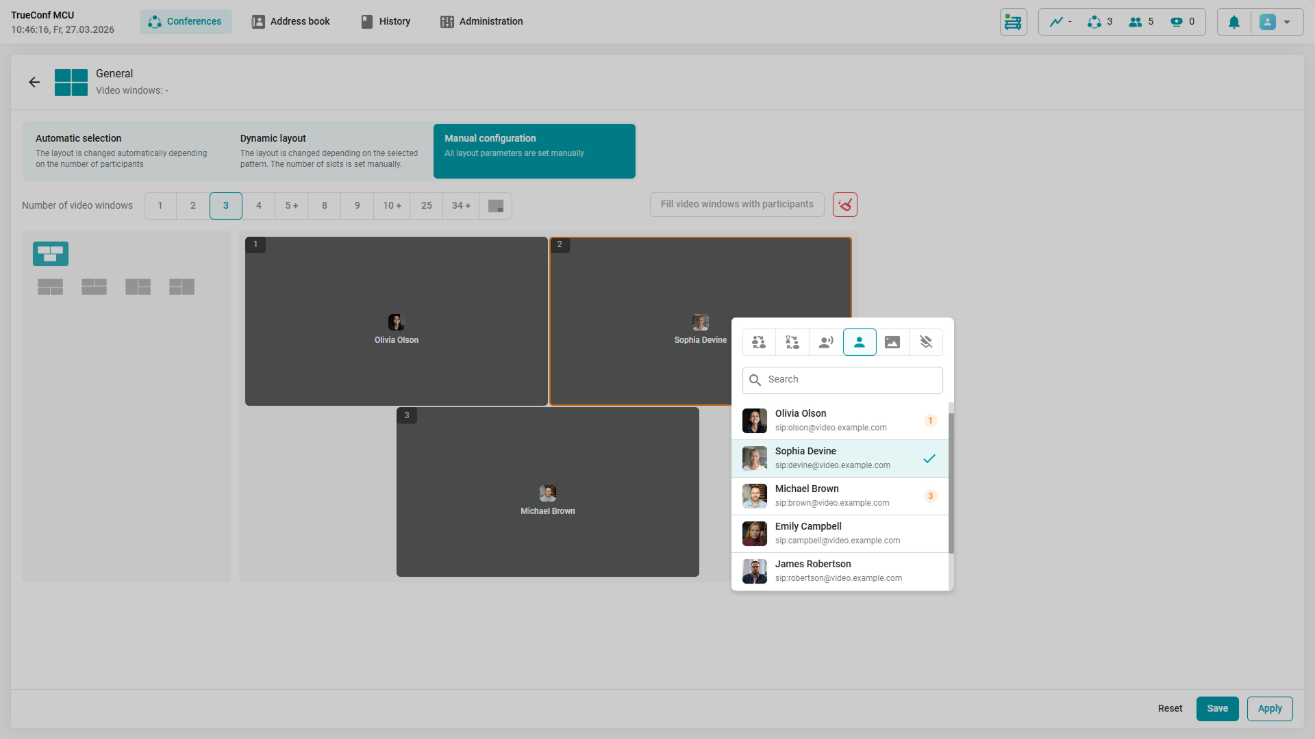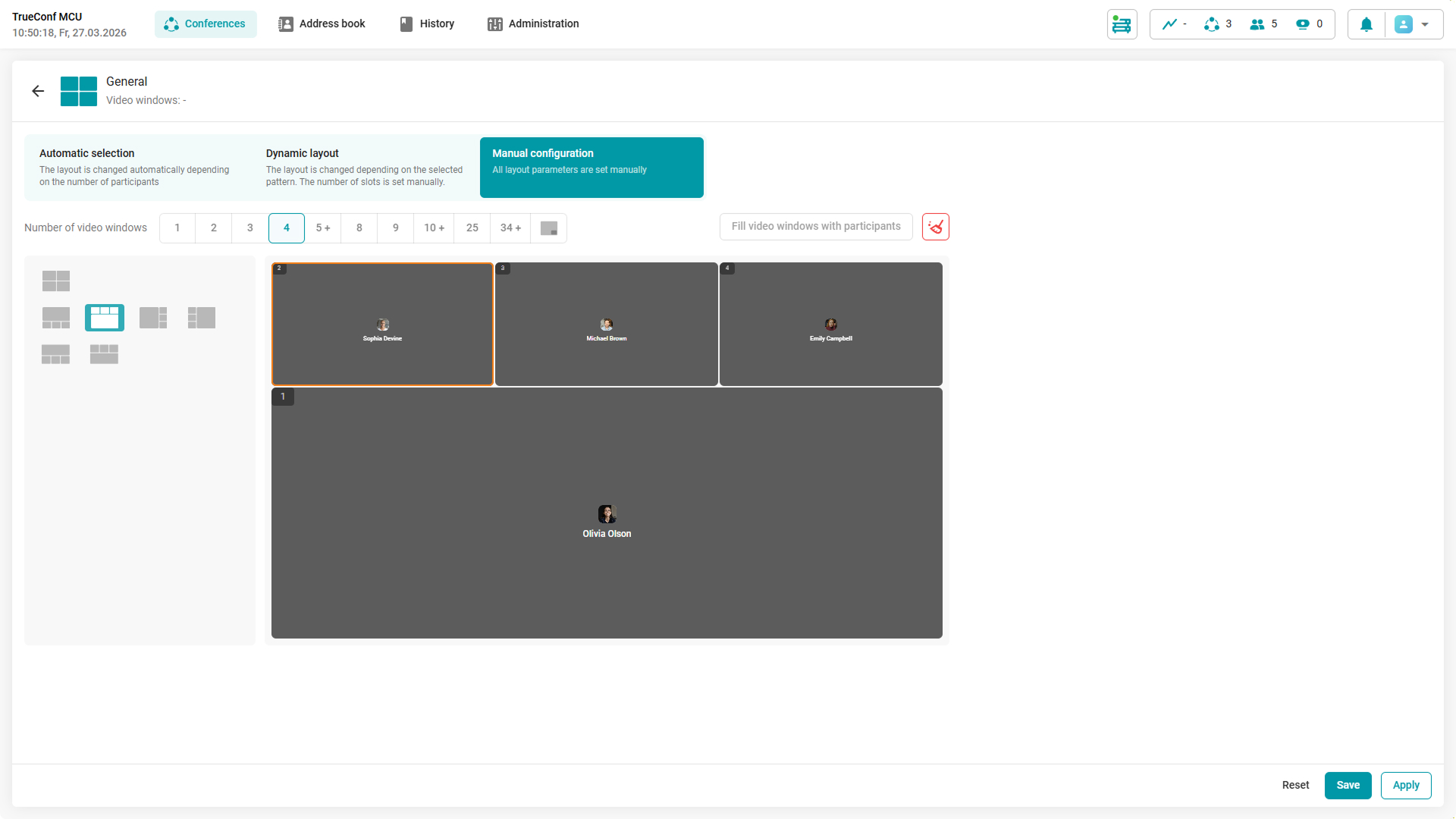 - Manual configuration — all layout parameters and video window content are set by the administrator or conference operator.