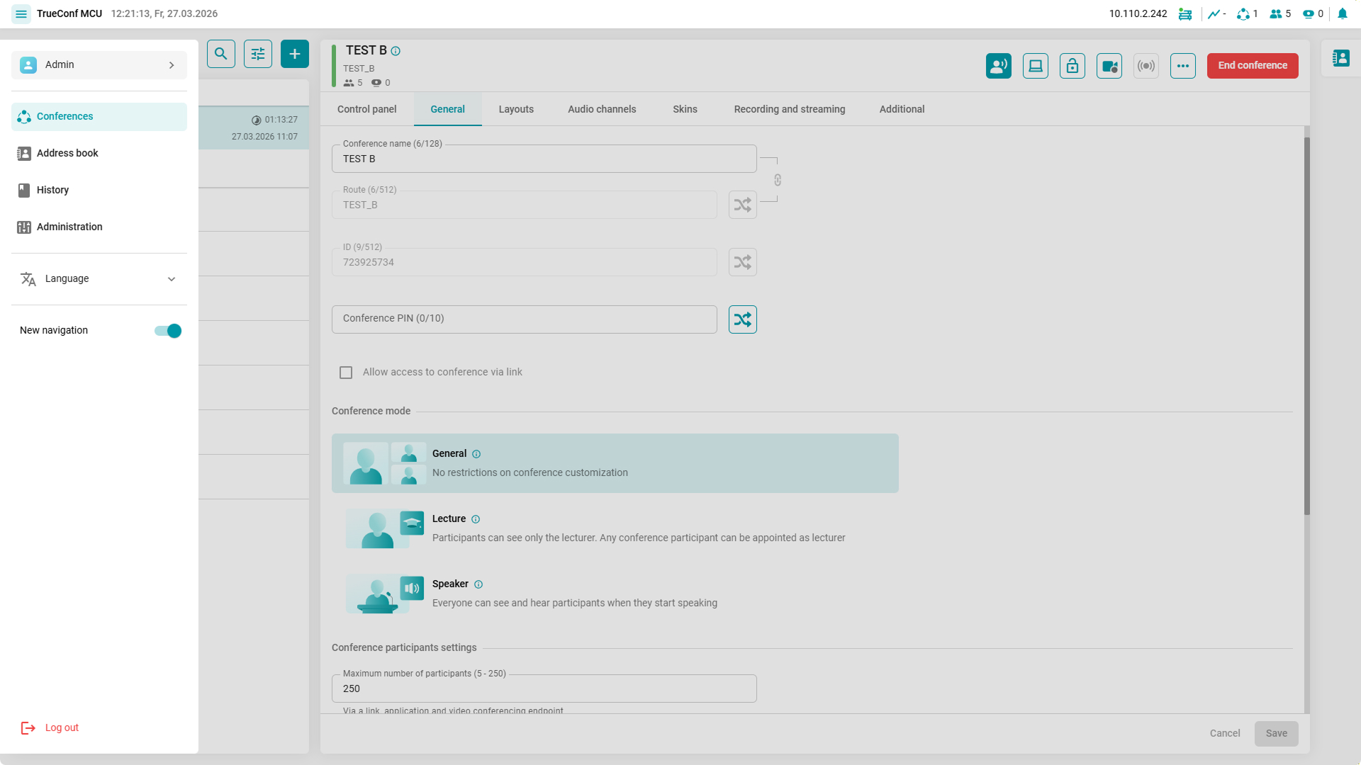 - A Domain address field has been added to the Administration → Calls section which is used in the conference address