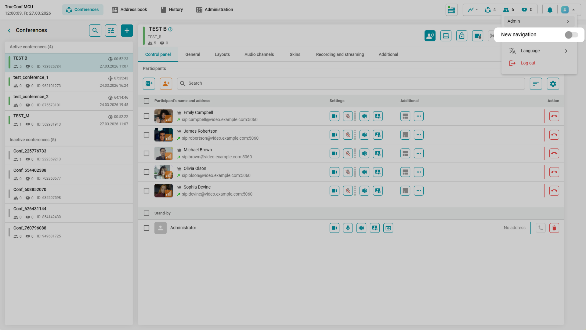 We’ve introduced a new menu layout option: basic information about TrueConf MCU is displayed in the upper-right corner of the screen, while the rest of the navigation elements are minimized to the sidebar, which opens by clicking on the Menu