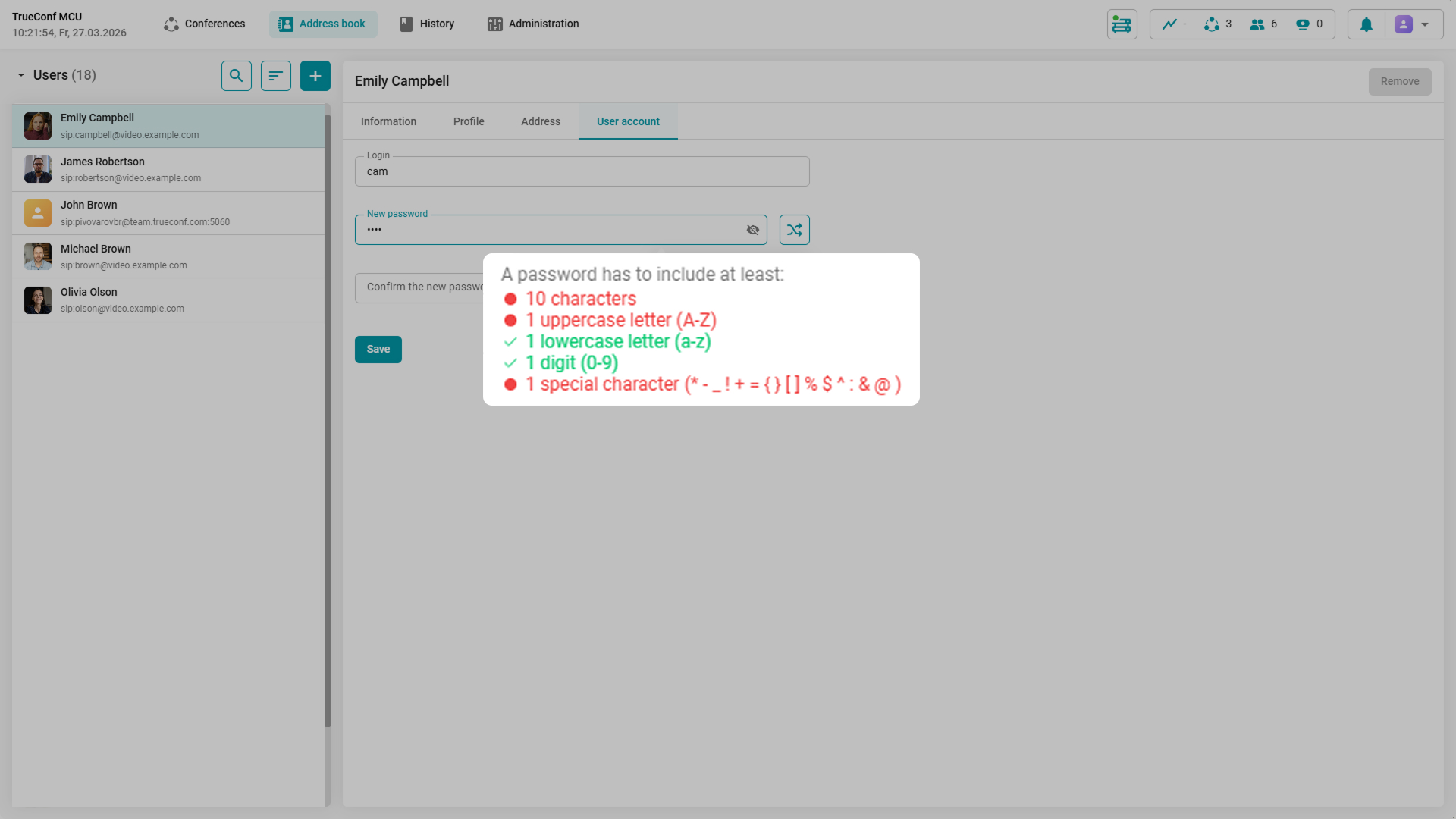 In TrueConf MCU 2.2, it is now possible to configure the password complexity for new accounts. The administrator can set: