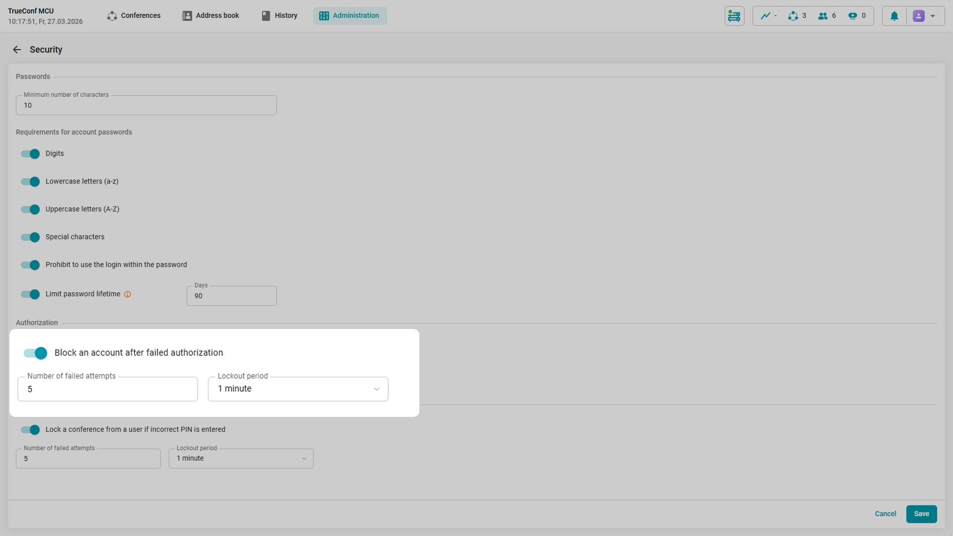 After several unsuccessful attempts to connect to the video conferencing server, the user’s IP address will be temporarily blocked. The administrator can determine the threshold for unsuccessful login attempts and the lockout duration.