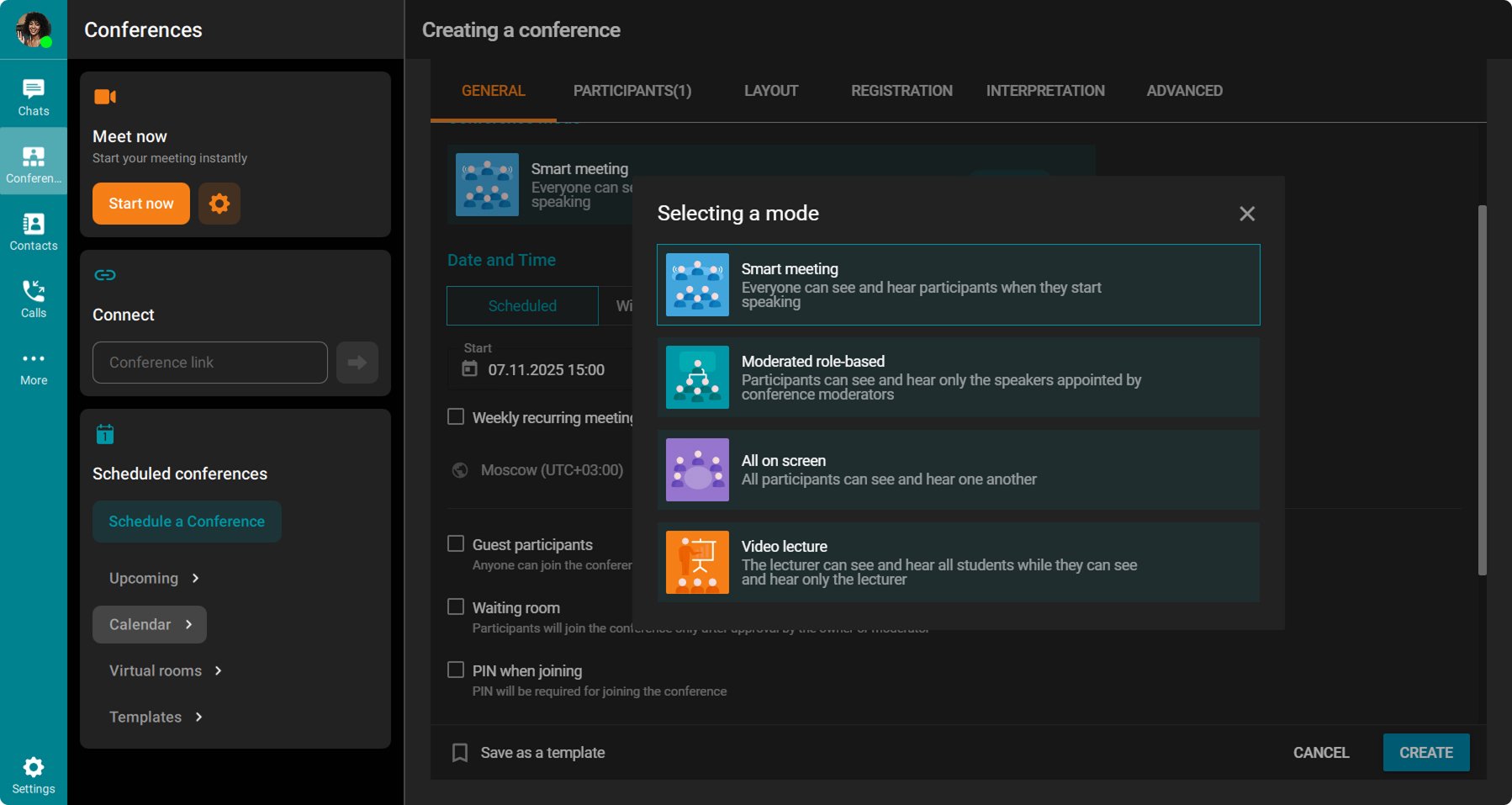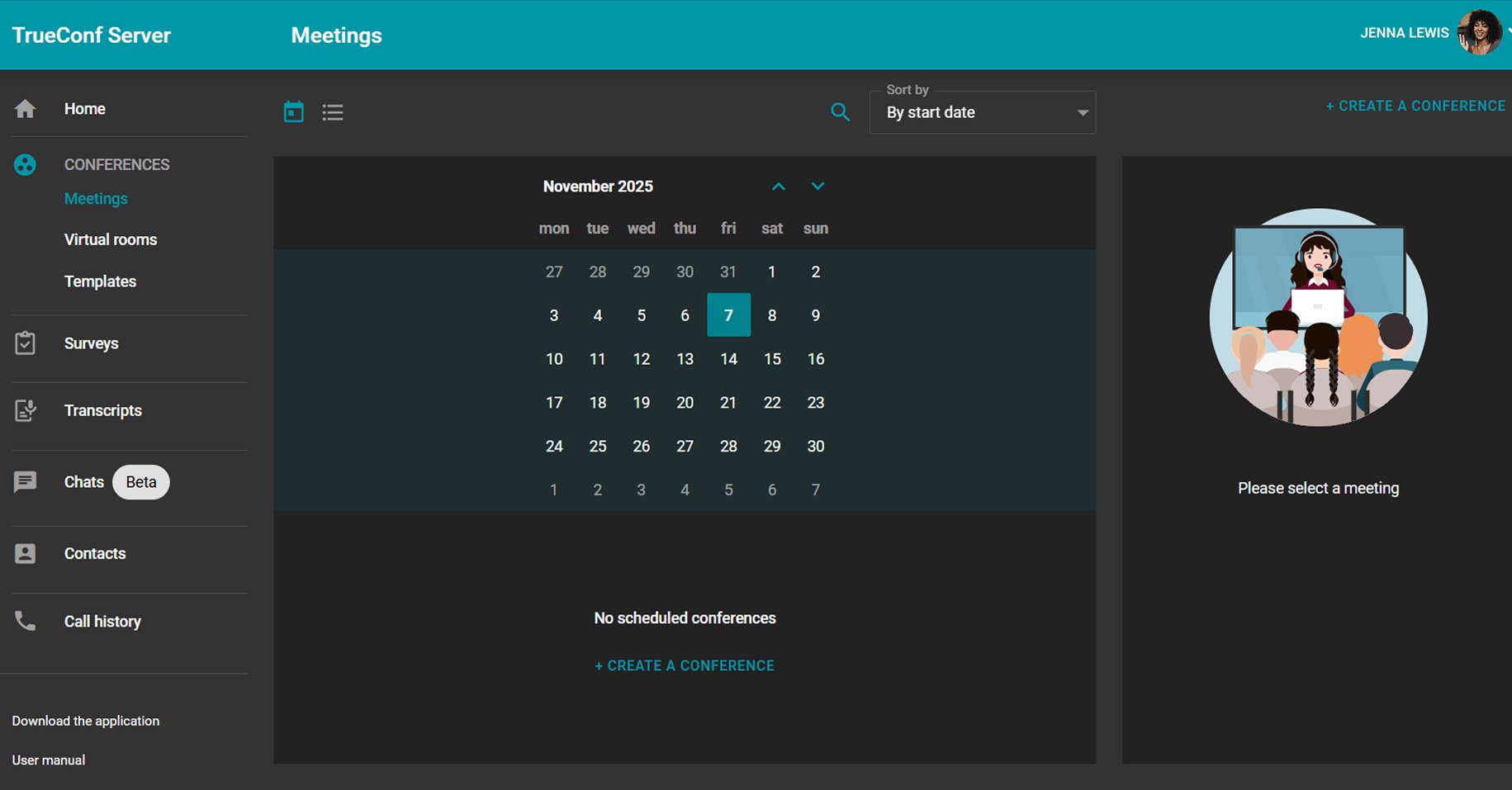 The conference scheduling section in TrueConf client apps has also received a visual update. If a dark theme is set in the application, the scheduler will be displayed in the same color scheme. In addition, the user personal area, which you can log in from the TrueConf Server guest page, has also received support for a dark theme — it is enabled automatically if the appropriate color scheme is set in the user’s browser.