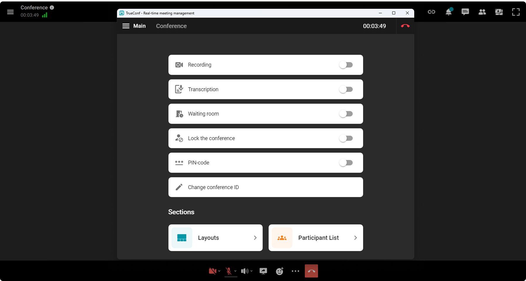 We’ve updated the interface of the real-time meeting management — all the necessary items have been moved from the context menu to the home screen. In addition, we have added the ability to enable or disable the conference transcription if you have integration with TrueConf AI Server configured.