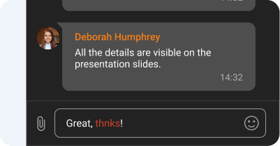 Troque mensagens durante conferências e além! Responda às solicitações de colegas em chats pessoais e em grupo, rapidamente transformando discussões em reuniões online.