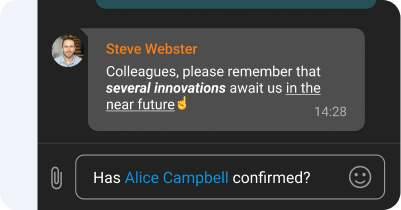 Um mensageiro de equipe seguro para comunicação instantânea, compartilhamento de imagens e arquivos e organização de trabalho remoto.