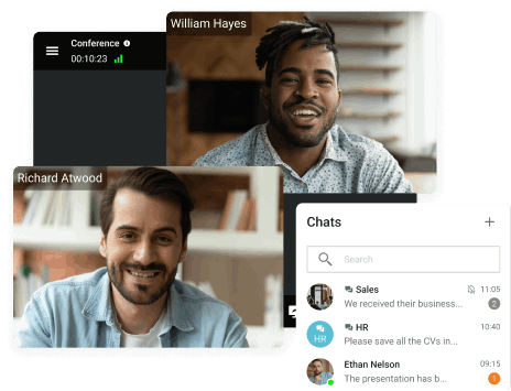 Videoconferência é um sistema de comunicação que permite aos usuários organizar videochamadas pessoais e conferências em grupo. Quando os membros da equipe estão geograficamente dispersos, as tecnologias de telecomunicação permitem a troca interativa em tempo real de dados de áudio e vídeo entre os participantes. A comunicação se torna mais conveniente e eficiente graças a uma ampla gama de recursos, incluindo ferramentas de colaboração, como apresentações, compartilhamento de tela e anotações.